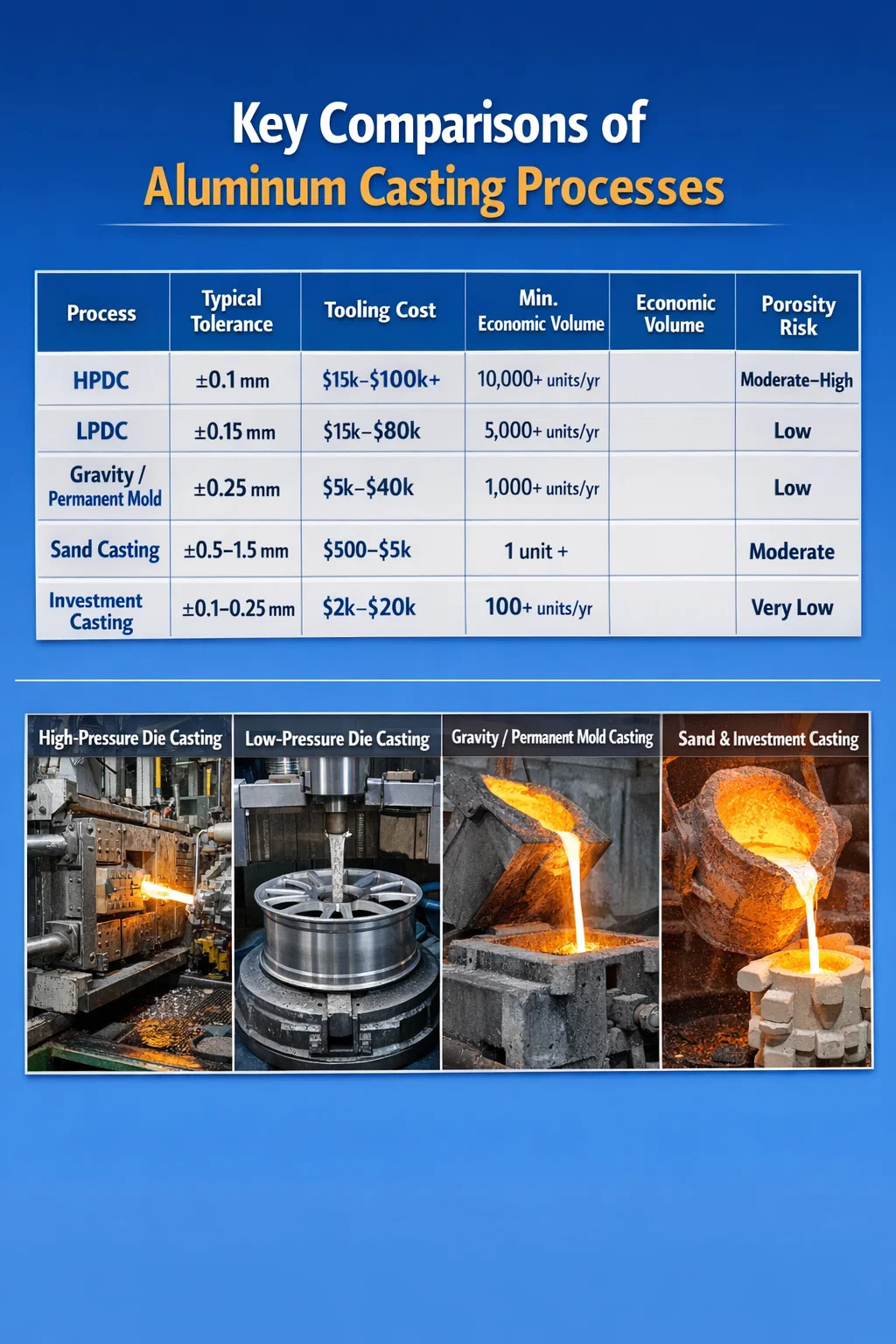 | LPDC | ±0,15 mm | $ 15.000 - $ 80.000 | 5.000 eenheden/jr | Laag |