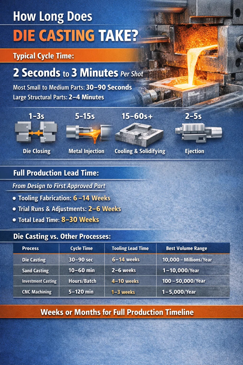 Dat cyclustijdcijfer vertelt slechts een deel van het verhaal. Voordat het eerste goede onderdeel van de band rolt, omvat een spuitgietoperatie de fabricage van gereedschappen (wat 6 tot 14 weken kan duren), het instellen van de machine, het voorverwarmen van de matrijs, proefopnamen en dimensionale validatie. Van het ruwe ontwerp tot het goedgekeurde productieonderdeel, de volledige tijdlijn wordt gemeten in weken of maanden, niet in seconden.