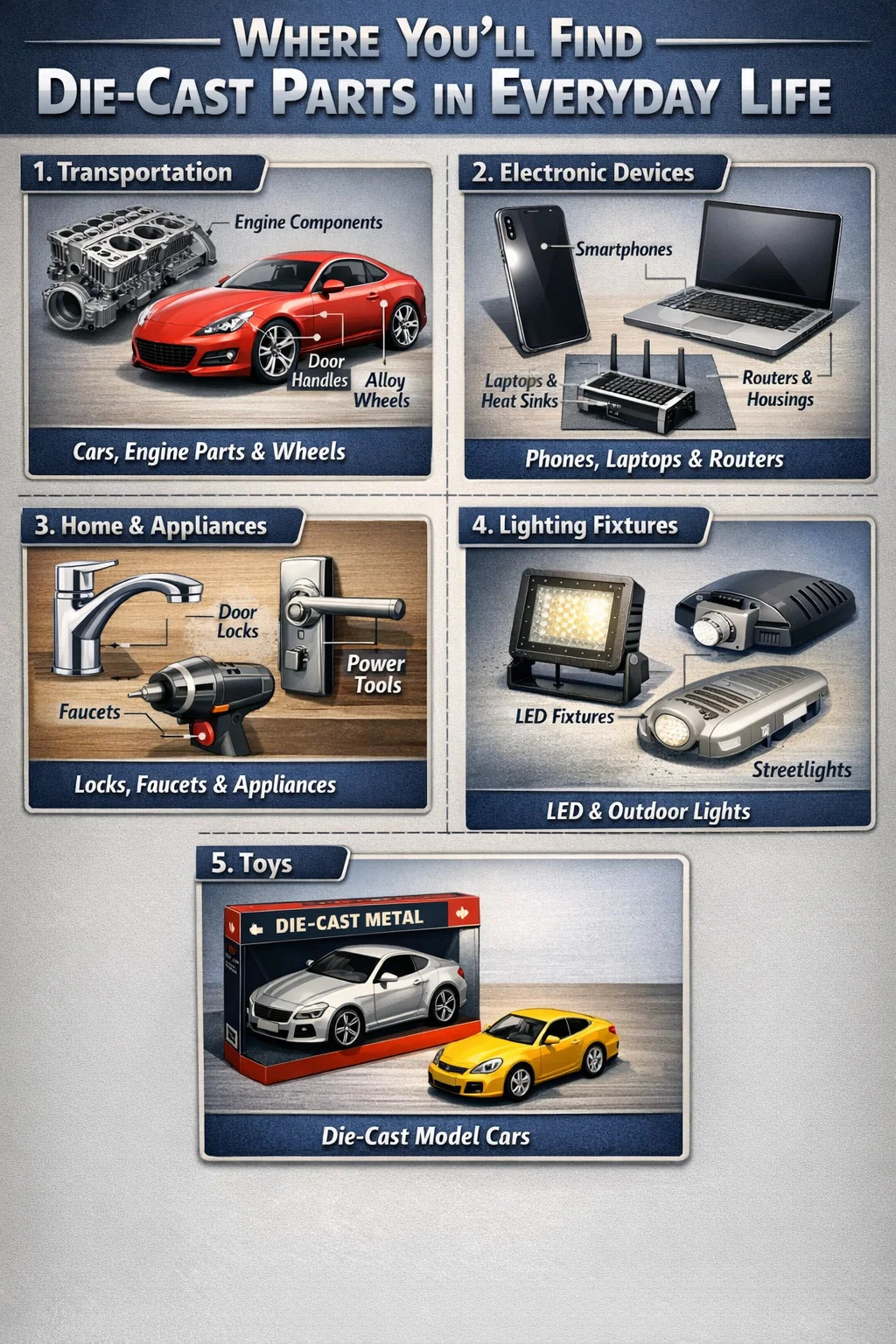Kleine apparaten: de metalen koppen van boormachines, de interne frames van stofzuigers en de behuizingen van koffiezetapparaten.