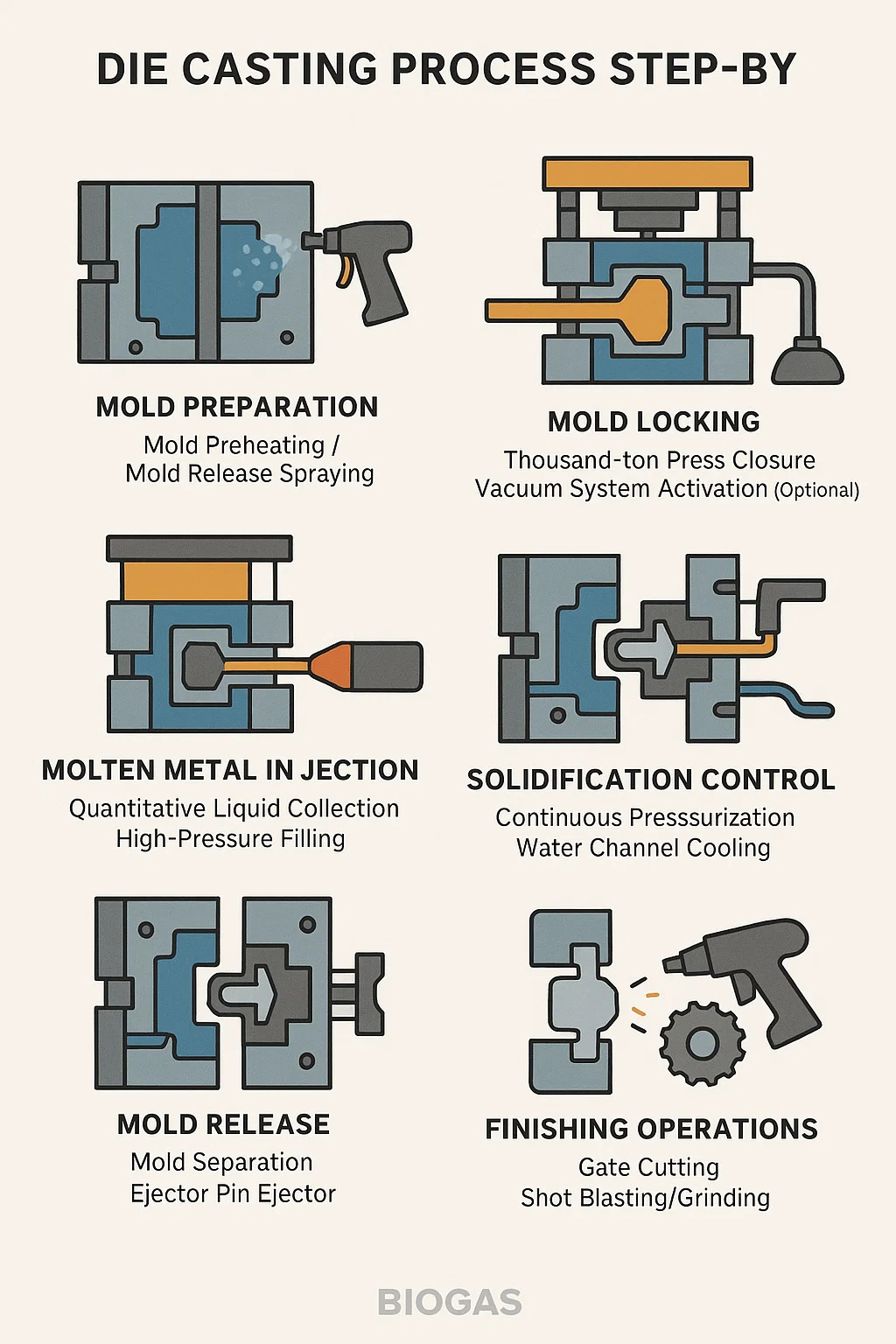 Continue drukverhoging: De plunjer handhaaft een hoge druk gedurende 10-30 seconden om de krimp van het gesmolten aluminium tijdens het stollen te compenseren.
